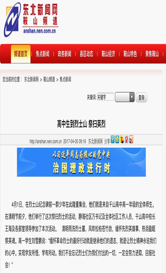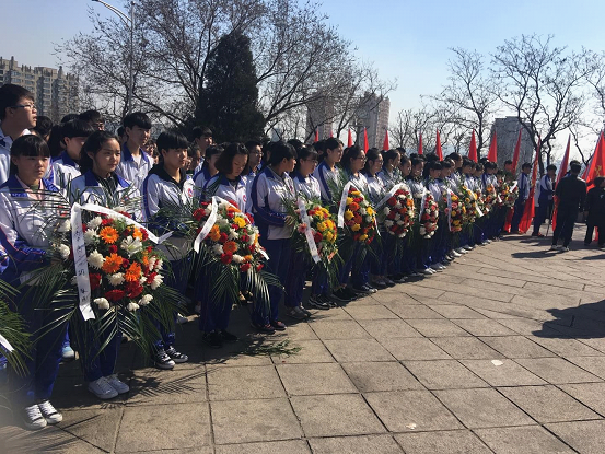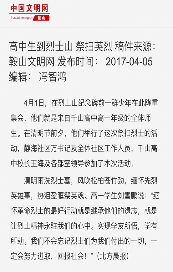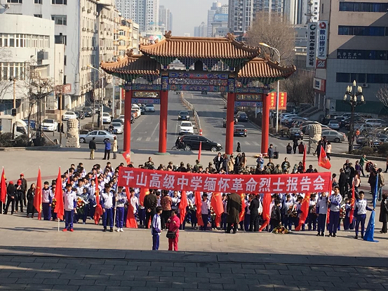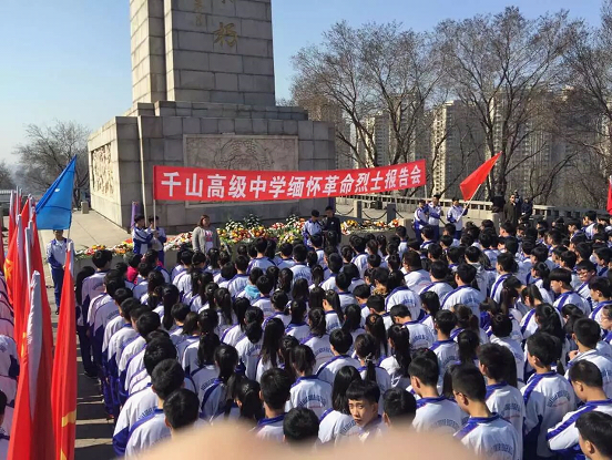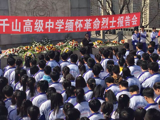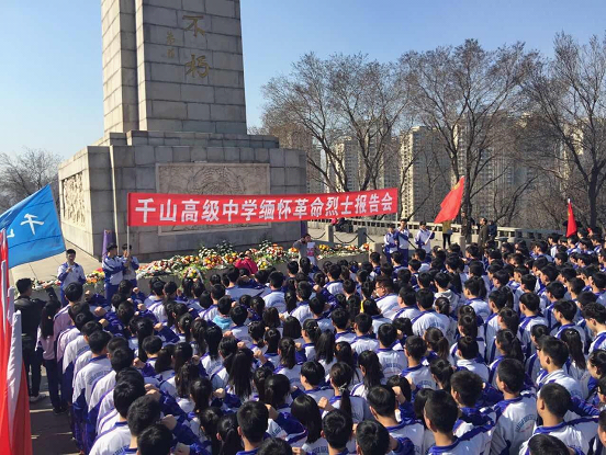 千山高中缅怀革命烈士报告会2019年3月29日 2003次4月1日,千山高中高一全体师生在烈士山纪念碑隆重集会,举行了这次祭扫烈士的活动,静海社区万书记及全体社区工作人员,千山高中校长王海及各部室领导参加了本次活动。 清明雨洗烈士墓,风吹松柏苍竹劲,缅怀先烈英雄事,热泪盈眶祭英魂。高一学生刘雪鹏说:“缅怀革命烈士的最好行动就是继承他们的遗志,就是让烈士精神永驻我们的心中。实现学友所悟,学有所动。我们不会忘记烈士们为我们付出的一切,一定会努力进取,回报社会! ←上一页 返回前页 下一页→