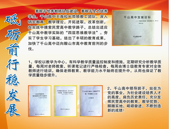 我校自1994年成立以来已走过23载,培养出500余名一本生,同时实现升学率100%。学校整体推进素质教育,不仅措施得力、成效显著,更引发了社会的极大反响和广泛关注。鞍山市教育局组织公办高中和民办高中的领导于11月3日下午莅临我校,对我校的教育教学成果进行观摩检查。