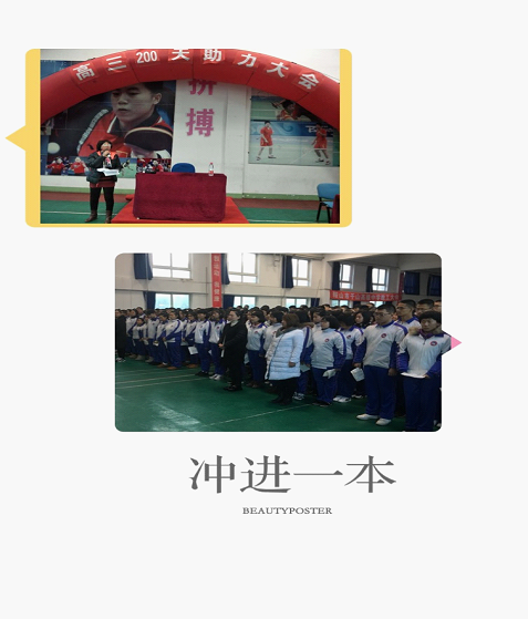 首先,由高三所有的班主任上台发表激情洋溢的讲话,他们不仅指出了本班同学目前存在的不足,更对全班同学冲刺阶段的学习、生活提出了具体要求,并希望全班同学凝聚全部的力量,珍惜时间,用拼搏成就自己的理想,用优异的成绩向学校和家长回报。