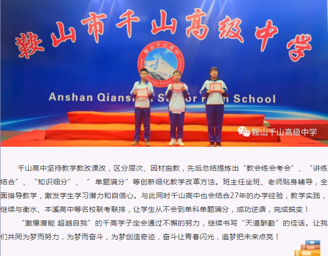 鞍山市千山高级中学 激爆潜能 追求卓越 低进高出 优进精出
