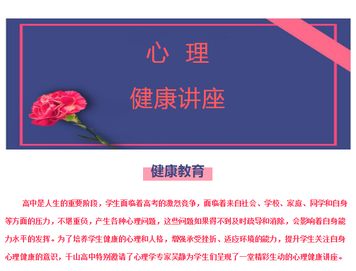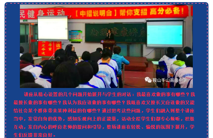 鞍山市千山高级中学----命运掌握在自己手中 ——心理学专家吴静来我校为学生做心理健康讲座