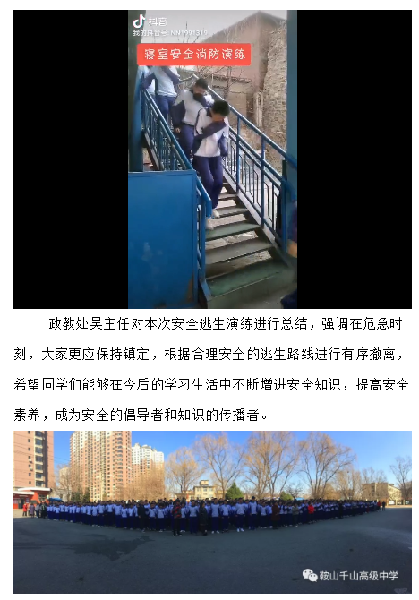 关注消防安全,共建和谐校园 ——千山高中开展寝室安全逃生消防演练活动